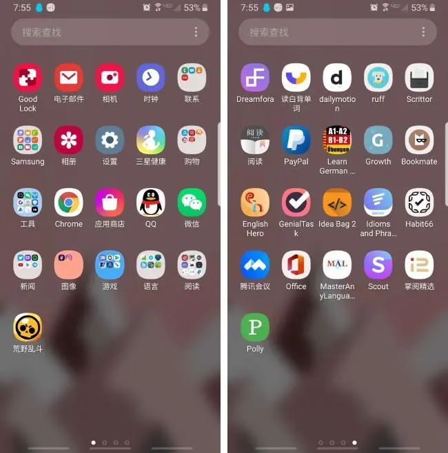 通过在首屏上划,可以直接到达应用界面。顶部的搜索框我几乎未曾使用过。在这个页面可以看到,针对各类应用,我只是做了一个初步分类。得益于目前各手机系统的优化,它可以给分组应用提供一个准确的分类,如:游戏,新闻,阅读,工具等。