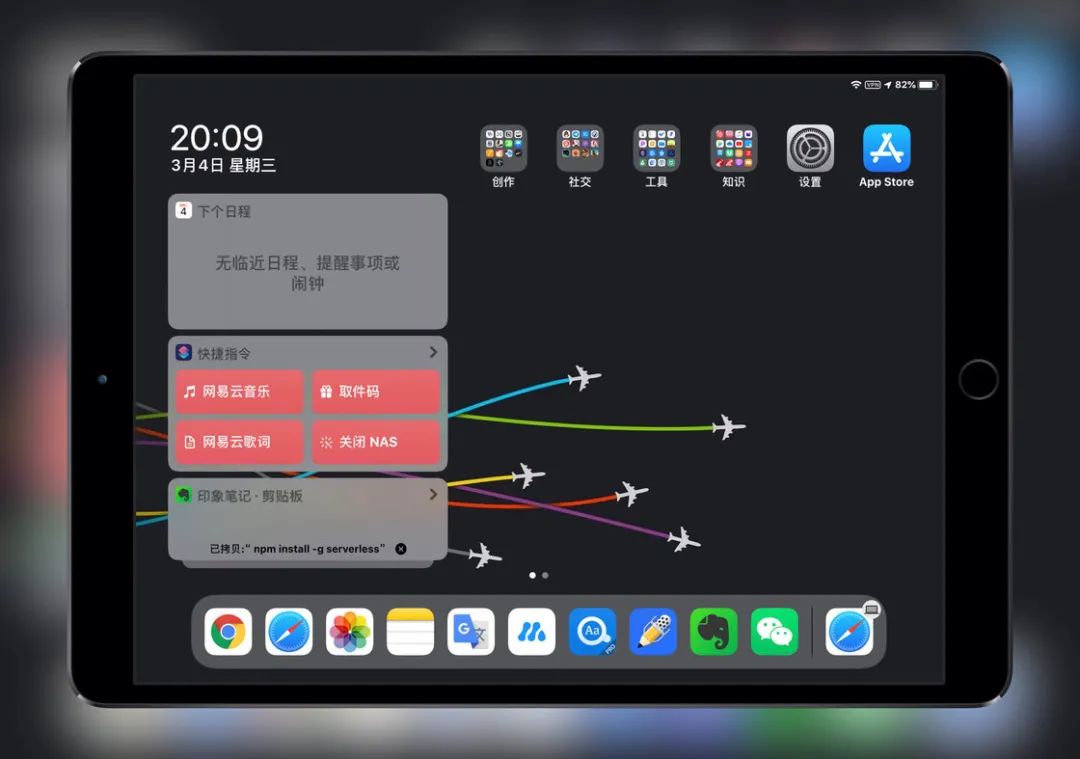 iPad 上的排布规则与 iPhone 上的大致相同,Dock 栏则增添了效率工具,方便在使用其它应用的时候快速使用其中的应用。