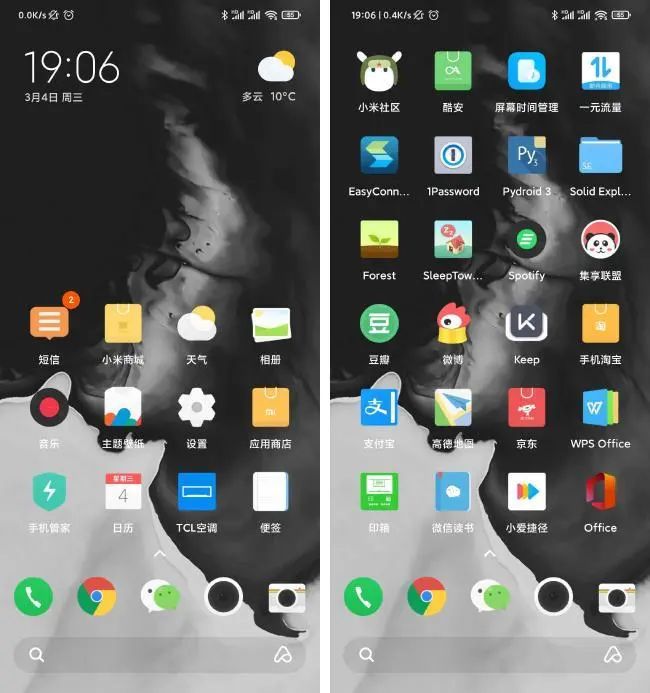 至于桌面图标,我会保留出厂第一屏,从第二屏开始摆放 1-2 屏最常用的应用,并随缘按照应用分类 / 派别摆放。这里要提一下桌面壁纸:很多桌面壁纸都因为 MIUI / iOS 自带的壁纸调整功能没内味儿了,在线蹲一个好看的壁纸合集~
