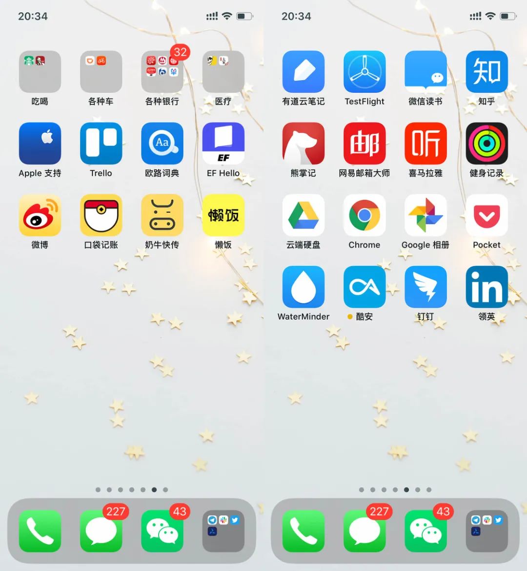 对于手机而言,换了 iPhone 之后,布置桌面的乐趣和动力都少了很多,一方面是因为 iPhone 原生的用户界面就很好看,另一方面也是因为 iPhone 桌面能改改的只有图标顺序和壁纸这两点,而且图标之间是无法插入空白的,所以排来排去,只能围绕四个字:「视觉隔离」。