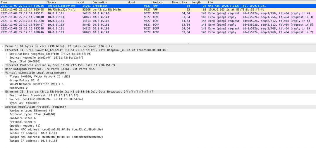 使用 Linux 内核 VXLAN 封装数据包的方式和原理上文已经介绍过了,Flannel 创建了一个名为 flannel.1 的 VETH 设备。因为