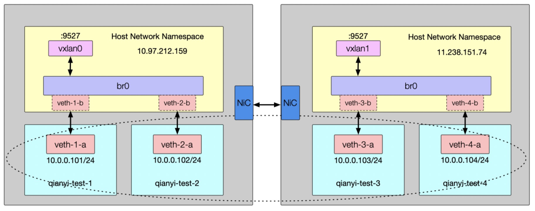 在做的。这个方案优缺点都很明显,最大的优点自然是性能,实打实的直接转发(性能整体比宿主机层面的通信低 10%,VXLAN 可是20% 起步,甚至 30%)。缺点也很明显,这种方式要求宿主机之间是二层连通的,还需要对基础设施有掌控权(编辑路由表),这个在云服务环境一般较难实现,另外规模越来越大时候的路由表规模也会随之增大。这种方式原理上比较简单,图不画了。