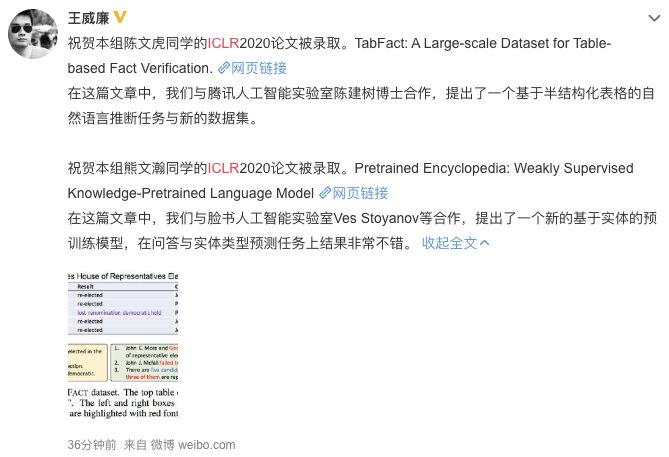 UCSB计算机科学系助理教授王威廉参与的多篇论文被接受。包括陈文虎同学的“TabFact: A Large-scale Dataset for Table-based Fact Verification”,在这篇文章中,我们与腾讯人工智能实验室陈建树博士合作,提出了一个基于半结构化表格的自然语言推断任务与新的数据集。以及熊文瀚同学的“Pretrained Encyclopedia: Weakly Supervised Knowledge-Pretrained Language Model ”,在这篇文章中,我们与脸书人工智能实验室Ves Stoyanov等合作,提出了一个新的基于实体的预训练模型,在问答与实体类型预测任务上结果非常不错。