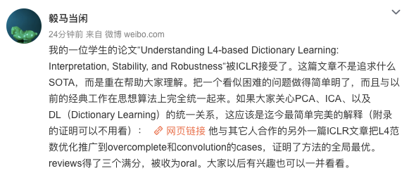 UC Berkeley EECS教授马毅表示,自己一位学生的论文被接受了。“这篇文章不是追求什么SOTA,而是重在帮助大家理解。把一个看似困难的问题做得简单明了,而且与以前的经典工作在思想算法上完全统一起来。如果大家关心PCA、ICA、以及DL(Dictionary Learning)的统一关系,这应该是迄今最简单完美的解释。”