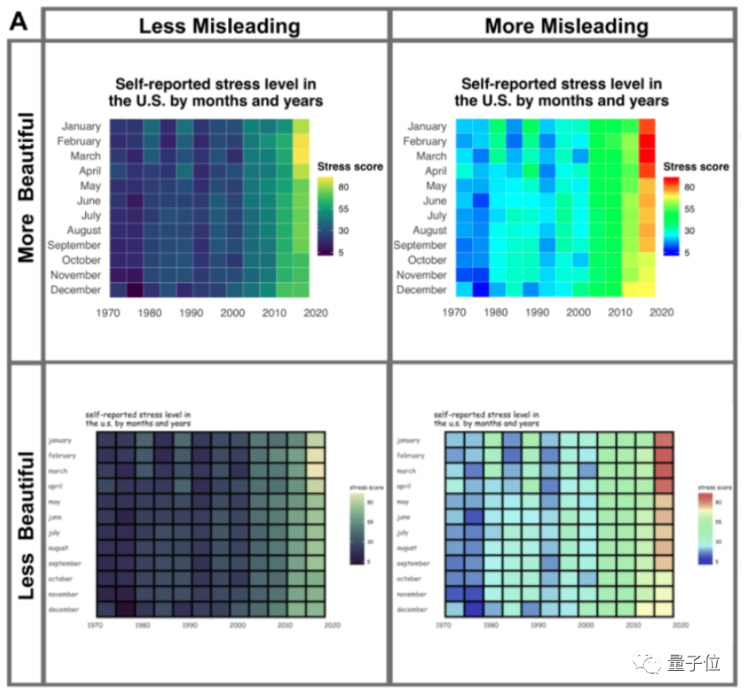 左上角是漂亮+低误导性;左下角是不漂亮+低误导性;右上角是漂亮+高误导性;右下角是不漂亮+高误导性。