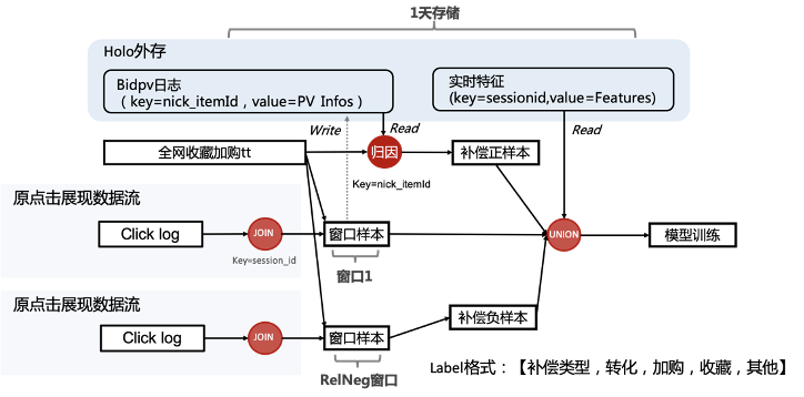 数据流程: 因为部分用户会“立即加购”或“立即购买”,部分正样本会很快回流。因此,为避免一些不必要的假负样本,我们建立一个数据流等待10分钟窗口,窗口时间到达时向样本流发送正负样本。10分钟外发生正样本再以补偿样本形式进入样本流。具体的如下图。首先,用 Holo 外存保存7天的样本存储作为归因逻辑的样本池。曝光发生10分钟后,未发生加购/转化行为的样本都作为负样本进入样本流。当实时的用户正样本进入到tt数据流之后,与7天存储的样本进行归因,再将归因后的补偿正样本注入样本流。