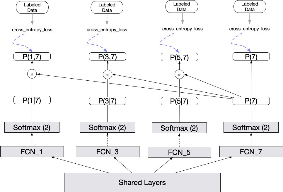 因此,我们的问题是,如何有效利用近6天样本,去优化7天归因转化的天级模型。我们提出一种天级样本延迟建模方式,通过一个端到端的多任务网络结构,同时建模转化模型和时延模型,隐式的通过时延模型影响实际转化模型的标签分布,达到准确学习7天转化模型的目的。