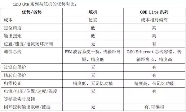 通过上表我们可以发现,QDD-Lite在控制方式、运动范围、供电方式等诸多方面,均比舵机有优势。QDD-Lite系列产品的确能够解决舵机出现的诸多问题,例如,定位精度低、无自我保护程序和通讯距离短且精度低等。对于机器人硬件行业来说,或将迎来一场革新。