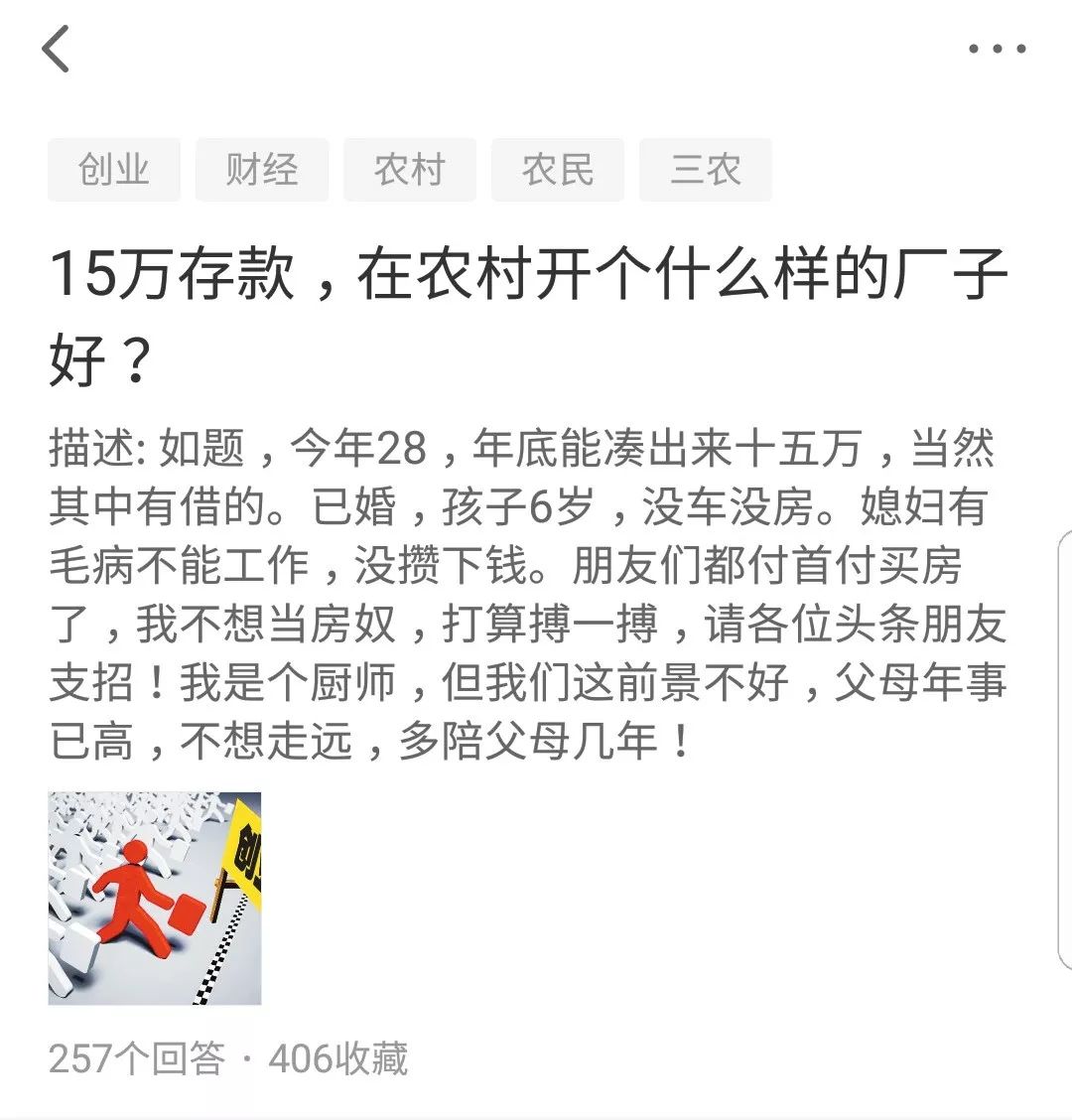 “15万存款,在农村开个什么样的厂子好?”这个问题在悟空问答有251个回答,在这些回答中,很多人都讲述了自己在农村开厂做生意的亲身经历,其细节之详细、叙述之具体是任何一个没有真实经历过的人很难编出来的。