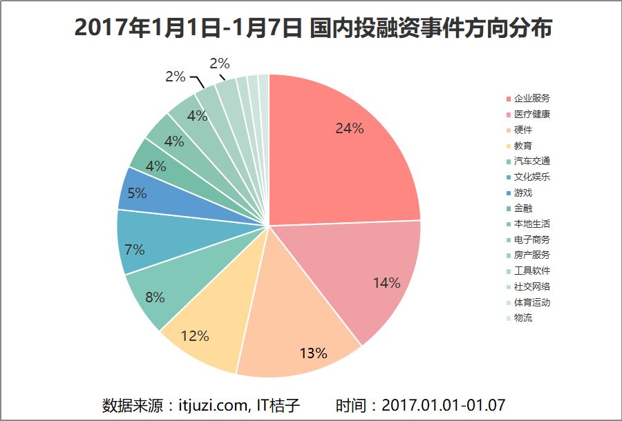 上周 IT 桔子共收录了 86 起国内投融资并购事件,覆盖 15 个行业领域。其中企业服务、 医疗健康成为上周投融资事件最多的行业,其次是硬件和教育领域。