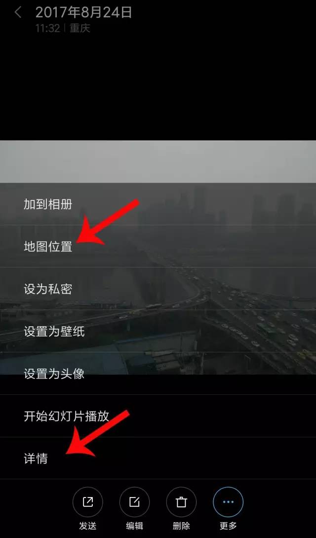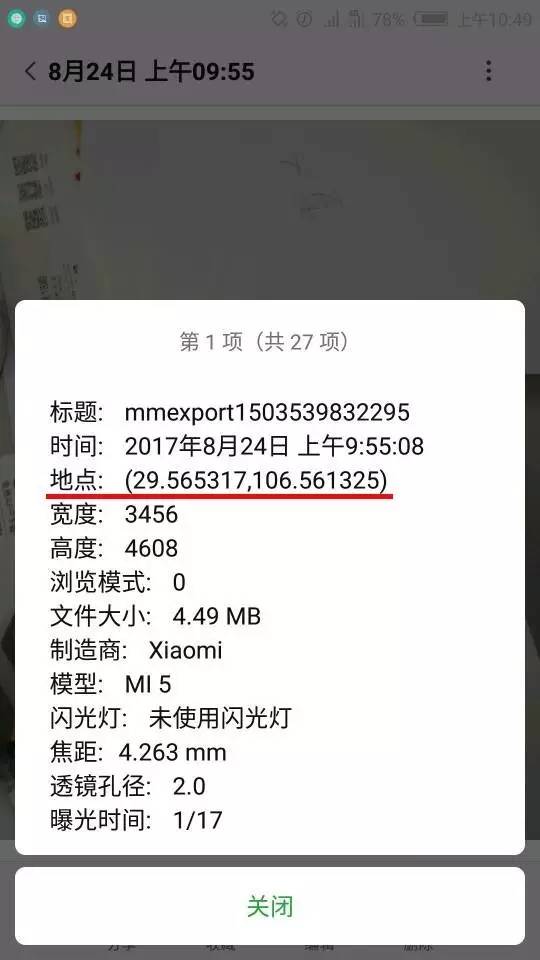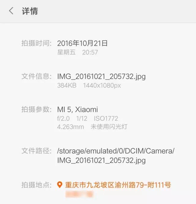 点击详情,可以看到拍摄的详细信息,包括经纬度地址,拍摄时间,手机型号等。在查询经纬度,你所在的位置就一目了然。