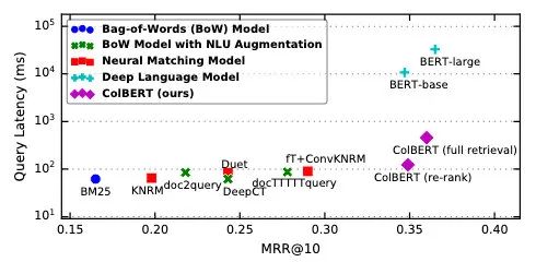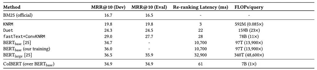 通过实验数据对比可以看出,ColBERT 的效果比传统 ConvKNRM 明显要好,此外检索的速度比 BERT-base 模型要快几个数量级。