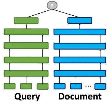 传统的 Representation-Based 模型是如下图所示的双塔结构,分别计算 Query 端和 Doc 端的隐层表示,最后选择 Score function(如dot product,cosine similarity)计算相似度。这种方式由于失去了 Query-Doc 之间的交互,可能会产生语义漂移,精度相对来说不是太高,所以一般用来做向量召回或者粗排[1]。