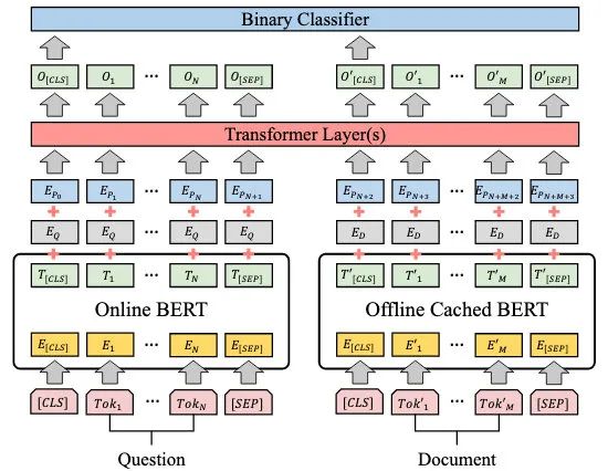 在测试期间,我们只使用在线 BERT 模型对问题进行一次编码,并从缓存中读出由 retrieve 模块检索得到的所有候选文档的缓存编码。