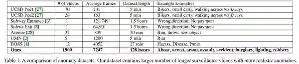 本文的另外一个贡献是提出了一个新的较大规模的异常事件检测数据集 UCF-Crime,参考下表,该数据集比起之前的数据集的优点主要是两方面:一是视频的数量和视频的总时长要远远多于之前的数据集,二是其中包含的异常事件类型比较丰富。