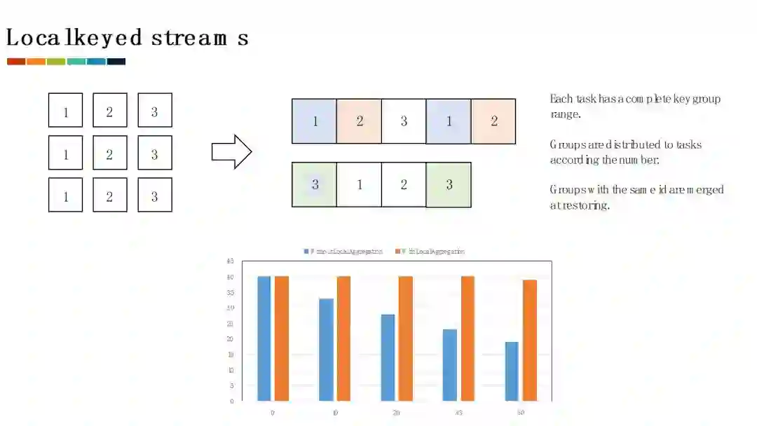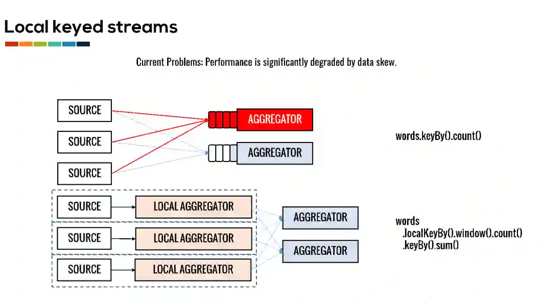 为了解决负载倾斜的问题,我们提供了Local Keyby算子,允许用户在task本地对数据流进行划分。划分得到的Local keyed streams和一般的Keyed streams是类似的。用户可以通过RuntimeContext访问keyed state,也可以在数据流上执行窗口操作。利用Local keyed streams,我们就可以在数据发送一端就进行本地的预聚合,统计一定时间段内word在当前task出现的次数。这些预聚合的结果然后被发送给下游,通过合并得到最终的结果。