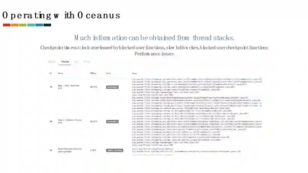 在即将发布的新版Oceanus中,我们还对TaskExecutor的线程信息进行了采集。这些线程信息能够很好地帮助用户定位发生的问题。例如checkpoint可能会由于多种多样的原因而超时。当用户实现的source function在被IO或者网络堵塞时并没有释放checkpoint锁,那么正在执行的checkpoint可能就会由于无法及时获取锁而超时。用户也有可能实现了一个堵塞的checkpoint函数,由于较慢的HDFS写入或者其他原因而导致checkpoint超时。通过观察线程信息,我们就可以容易的知道checkpoint超时的原因。