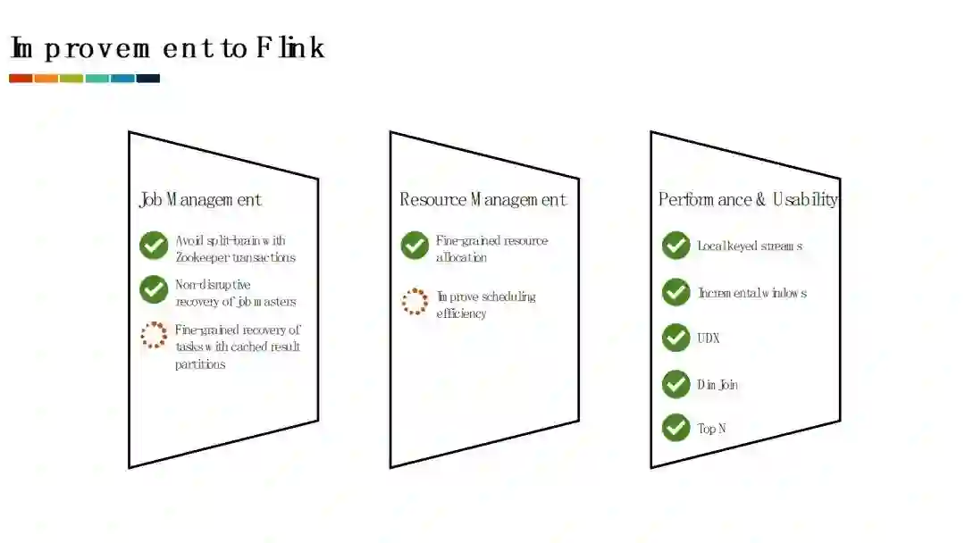 作业管理相关:我们对Flink的作业管理的改进主要以提高作业执行的可靠性为主,包括对分布式环境下的leader选举的重构和无需作业重启的Job Master恢复机制等。同时,我们也正在研究和开发细粒度恢复机制来减少发生故障时需要重启的task数目。