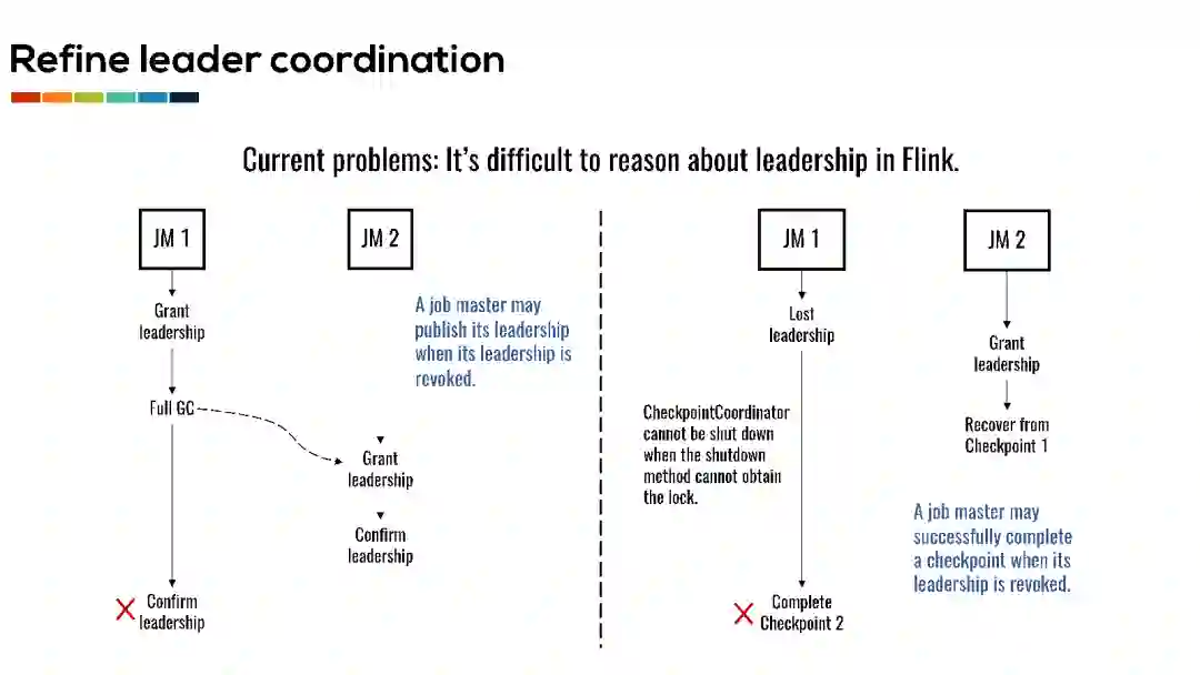 另一个由于leader选举导致的常见问题是checkpoint的并发访问。当一个master丢失leader节点之后,其需要立即停止其所有正在进行的工作并退出。但是如果此时旧master的Checkpoint Coordinator正在完成checkpoint,那么退出方法将无法获取到锁而执行。此时,在已经丢失了leader的情况下,旧master仍然有机会完成一个新的checkpoint。而此时,新master却会从一个较旧的checkpoint进行恢复。目前Flink使用了许多tricky的方法来保证多个master节点对checkpoint的并发访问不会导致作业无法从故障中恢复,但这些方法也导致我们目前无法对失败的checkpoint进行有效的脏数据清理。