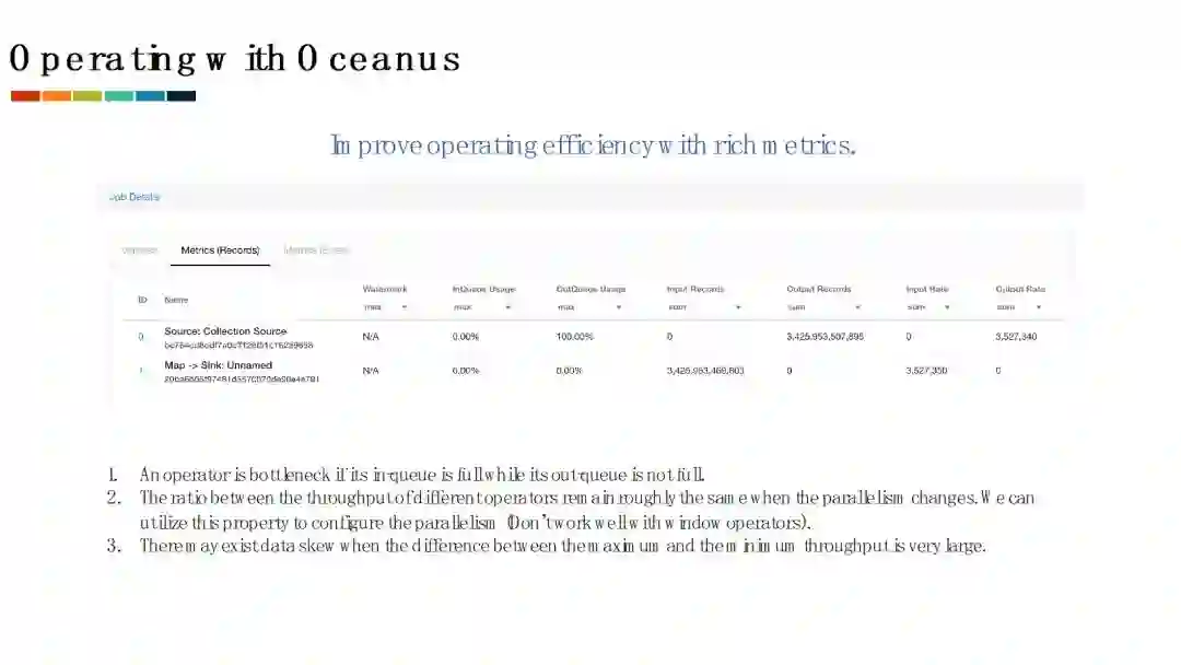 Oceanus对正在运行的作业采集了大量的指标,通过这些指标来监控作业运行情况,并在发生故障时定位原因。为了提高运维效率,我们根据长期积累的经验对运行指标进行了筛选,并对Flink UI进行了重构来合理展示这些指标。