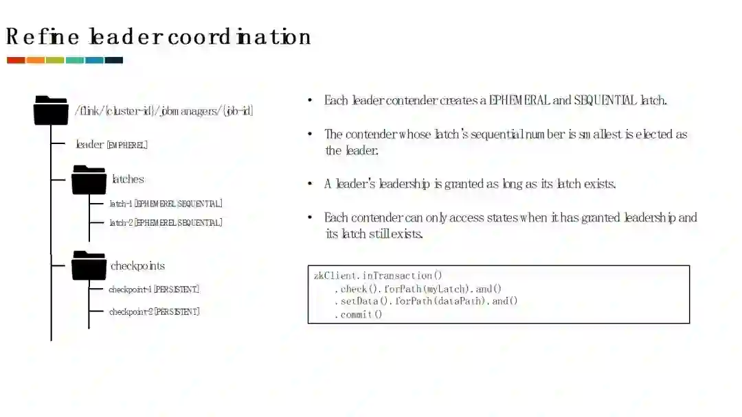 Zookeeper的实现保证了创建的latch节点的序列号是递增的。所以如果一个master节点被选为leader之后,只要它的latch节点仍然存在,就意味着它的序列号仍然是所有master节点中最小的,它仍然是集群中的leader。从而我们就可以通过检查一个master的latch节点是否存在来判断这个master是否已经丢失leader。通过将leader地址的发布以及对checkpoint的修改等更新操作和对latch节点的检查放置在一个Zookeeper事务中,我们可以保证只有保有leader的master节点才可以对作业执行状态进行修改。