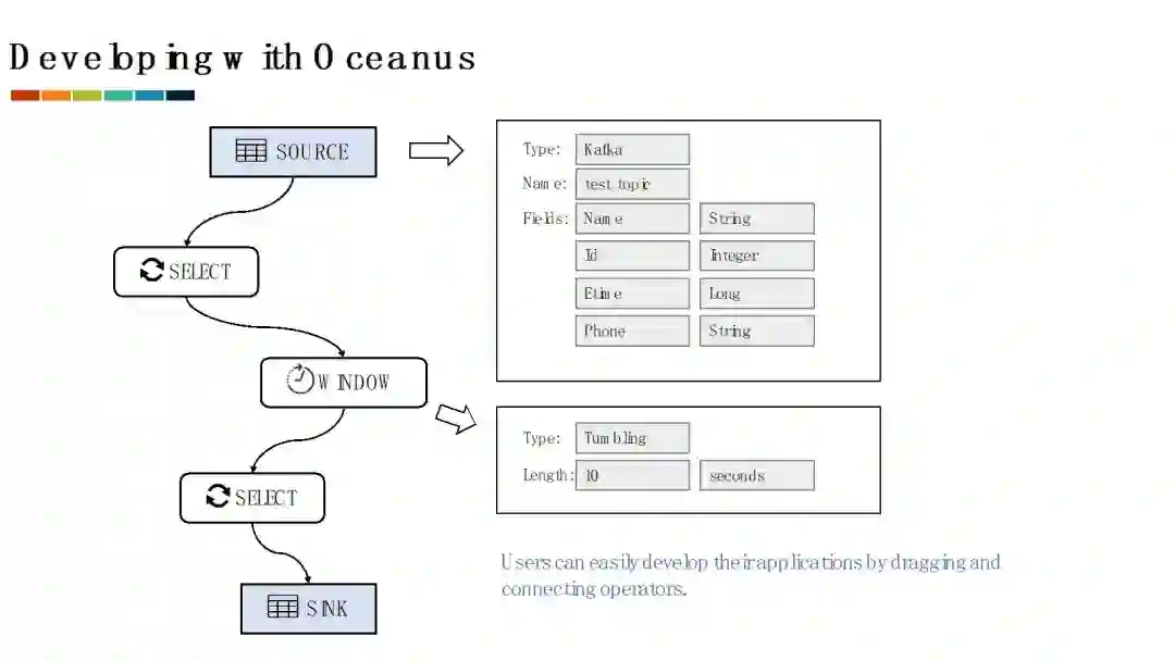 大部分Oceanus的用户可以使用画布方便的构建他们的实时计算应用。Oceanus提供了常见的流计算算子。在开发实时计算应用时,用户将需要的算子拖拽到画布上,配置这些算子的属性并将这些算子连接,这样就构建好了一个流计算应用。这种构建方式十分简单,不需要用户了解底层实现的细节,也不需要掌握SQL等语言的语法,使得用户能够专注于业务逻辑。