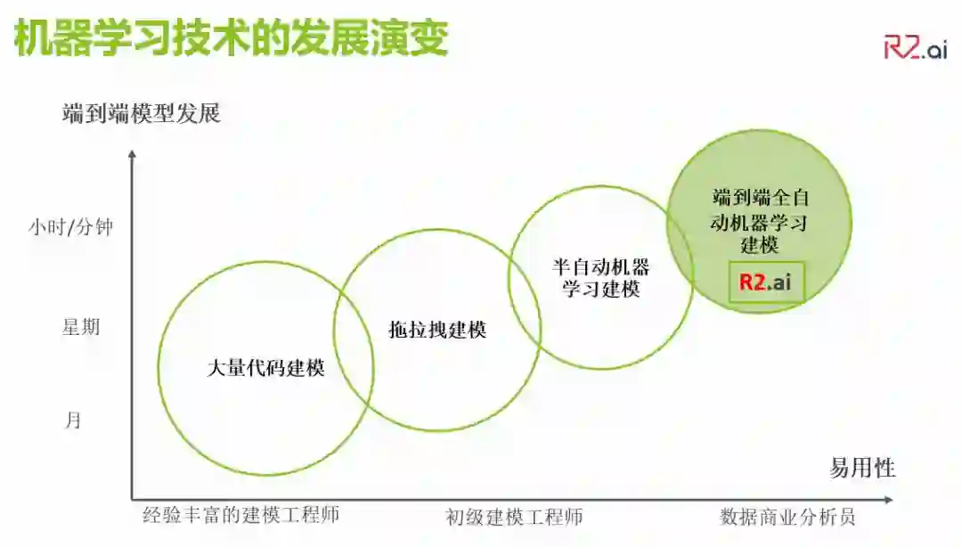 在数据量及数据维度呈几何级数增长的大数据时代,传统的建模方式,无论是模型算法的选择还是建模系统的架构都已经逐渐无法应对处理这些巨型数据的需求。为了使得机器学习变得非常容易、快捷、同时保证高质,其技术演变经历了一个复杂的过程。早期,开发人员的建模方式仍需大量的代码书写,在此之后的建模方式进化到所谓拖拉拽式的建模,再到近期的半自动建模(让机器学习做大部分建模流程),最后逐步转变为现在的全程自动机器学习建模。而全程自动机器学习的建模方式,其终极目标就是让初级建模工程师,甚至不具备工程师背景的数据商务分析人员,都能轻松建立精准的大数据预测和分析模型。