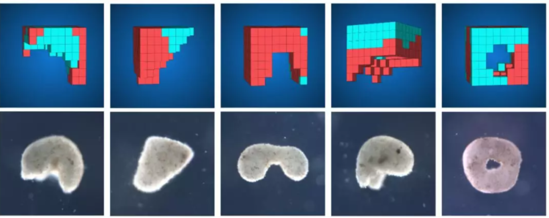 由大约 3000 个细胞组成的 Xenobot 母体自身形成了一个球体。「它们可以繁殖,但之后系统通常会消亡。实际上,让系统持续繁殖是非常困难的,」Kriegman 说。但借助在超级计算机集群上运行的 AI 程序,进化算法能够在模拟环境中测试数十亿种体型,比如三角形、正方形、金字塔、海星,用来找到在基于运动的「运动学」复制中更有效的细胞。