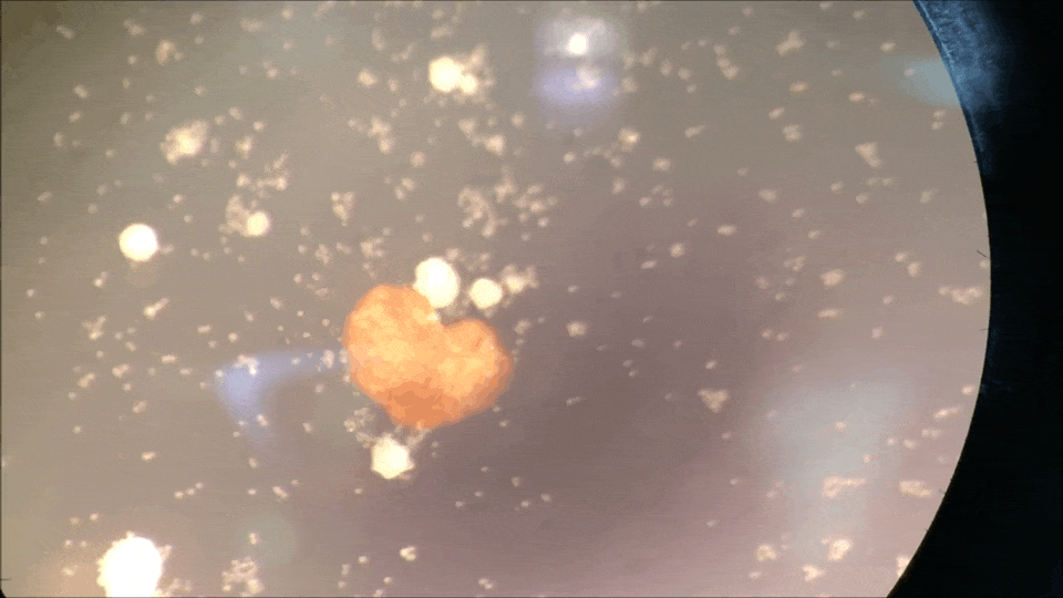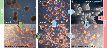 当产生的成熟细胞群被放置在直径 60 毫米的圆盘(B)中的约 60000 个分离的干细胞中时,它们的集体运动会将一些细胞推到一起成堆(C 和 D),如果这个堆足够大(至少 50 个细胞),即可发育成能够游走的纤毛后代(E),如果提供额外的分离干细胞(F),即可建立额外的后代。