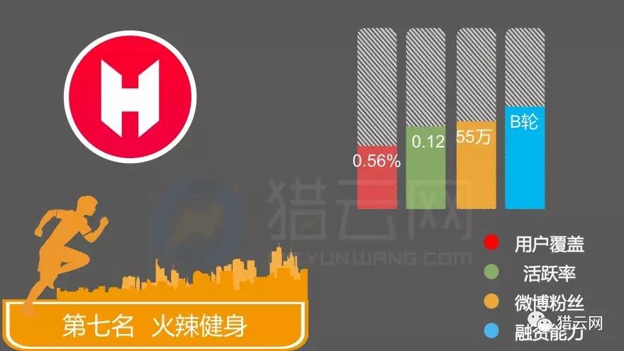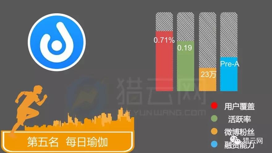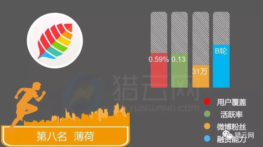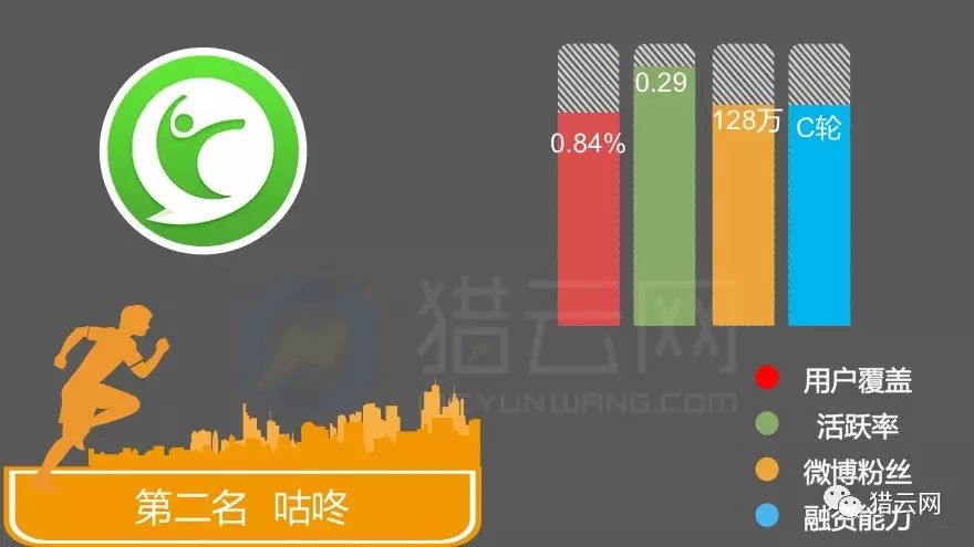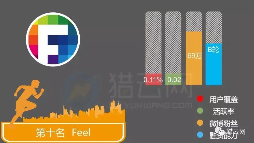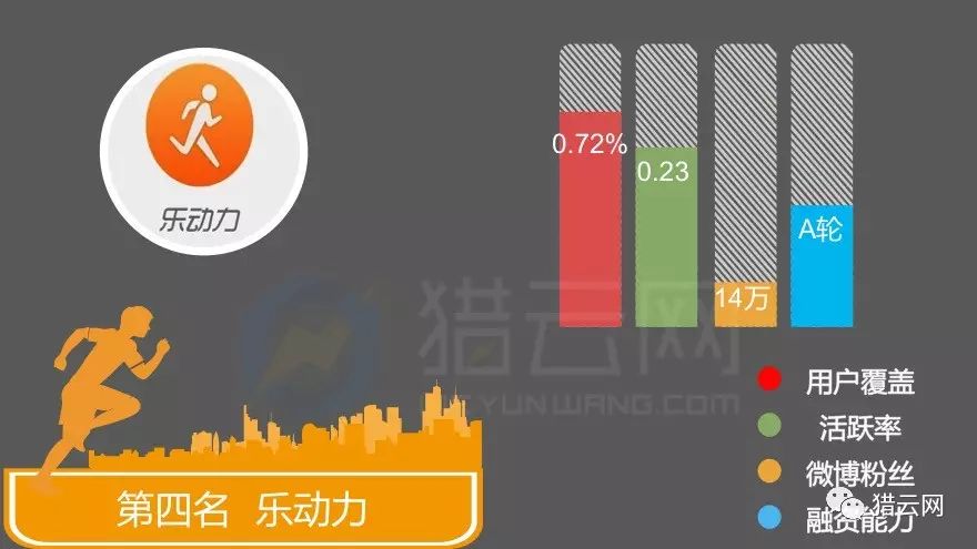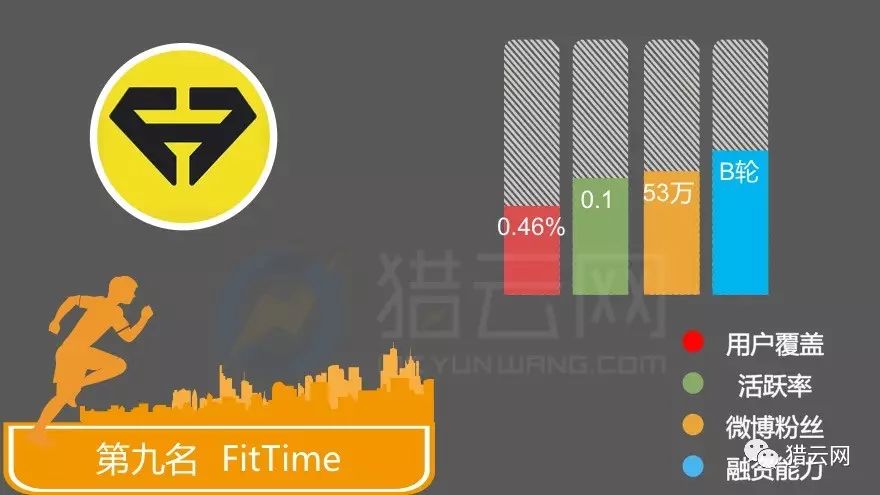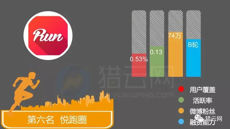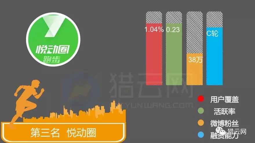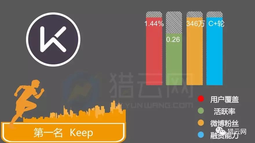 猎云君:排名第一的Keep在用户覆盖率、新浪微博指数、百度移动搜索指数、融资能力方面都处于霸主地位。尽管Keep用户覆盖率最高,但用户活跃率却是悦动圈居首。