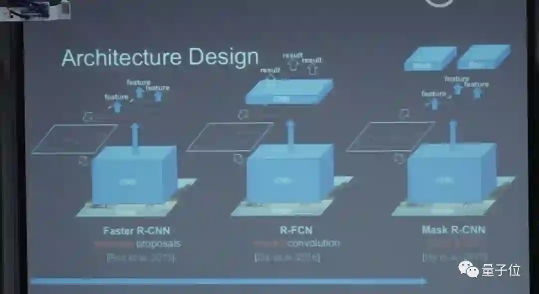后来又更优化了一下,做了一个非常有效的一步法检测器设计,这个就是Mask R-CNN,目前是最好的物体检测系统。