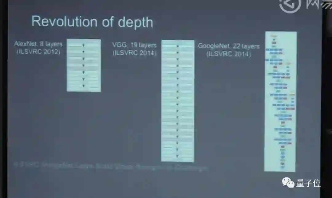 深度学习为什么叫深度学习?就是因为里面的层数很多,层数多了就叫深。AlexNet在2012年,做了一个八层的网络。这之前,大多数的网络只有三层,但是这个方法当时是受到质疑的。过了两年,一个牛津大学的研究组,把深度推到了20层;然后2015年微软研究团队做了个ResNet:152层的网络。
