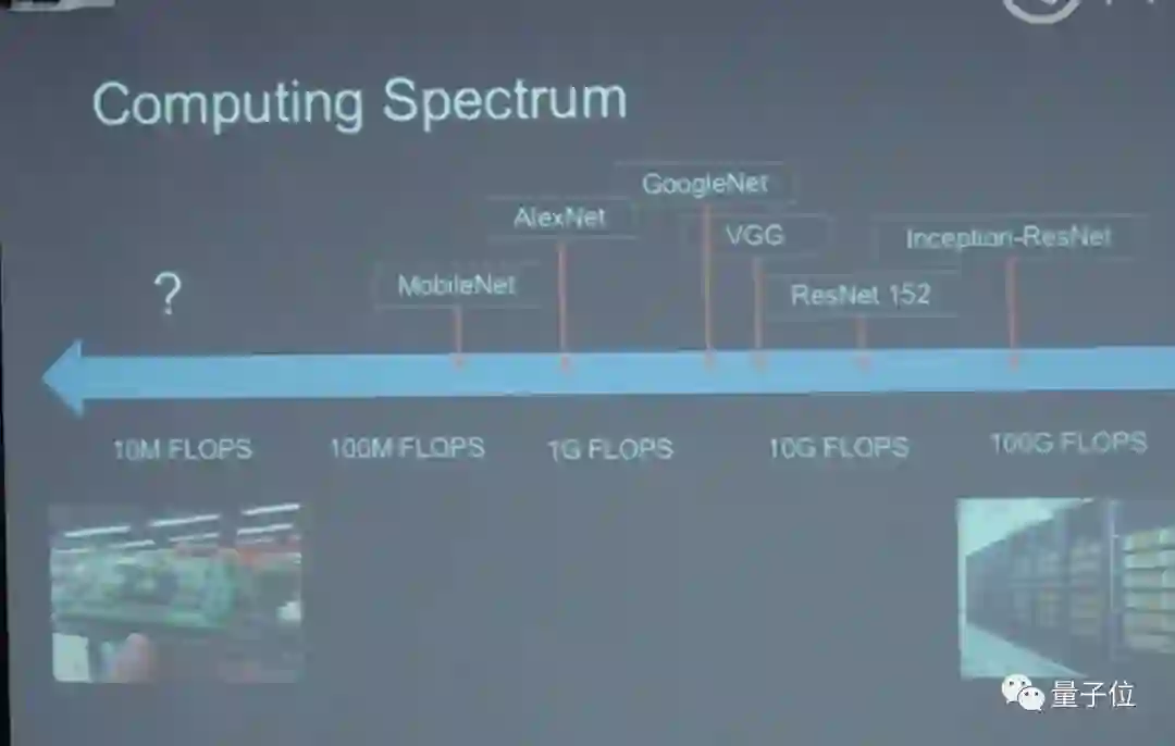 做了一个计算的轴,大家可以看中间是AlexNet,它的趋势是:越往右,清晰度越高,但是要求的网络计算复杂度越来越大;左边是低精度的,但是却是一个很大的需求。