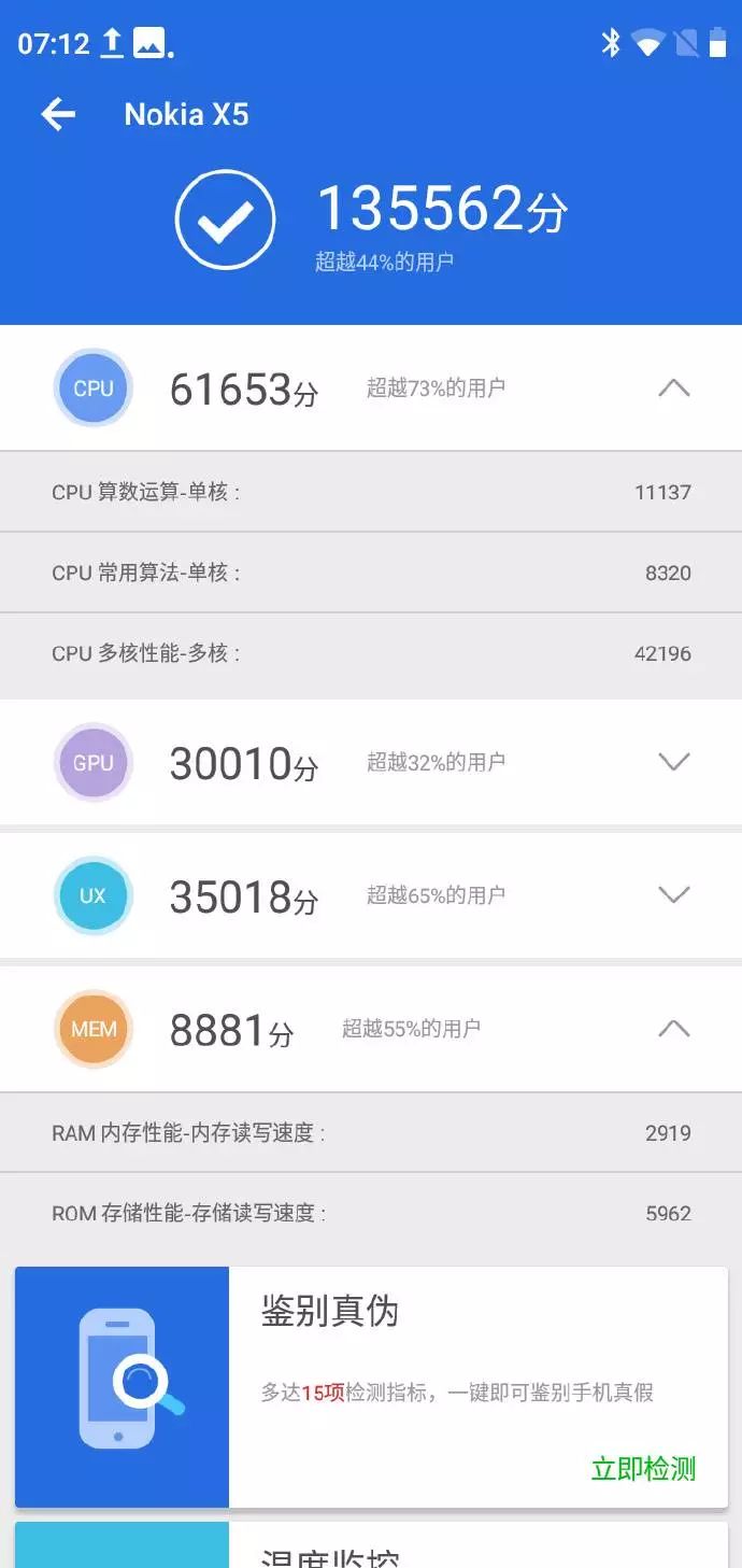 在安兔兔中,Nokia X5 的得分为 135562,不能与旗舰机过 30 万的分数比,但已经同价位翘楚了。这样的处理器再配合着 3GB/4GB RAM,Nokia X5 玩《王者荣耀》或者《刺激战场》都能保持不错的流畅度。