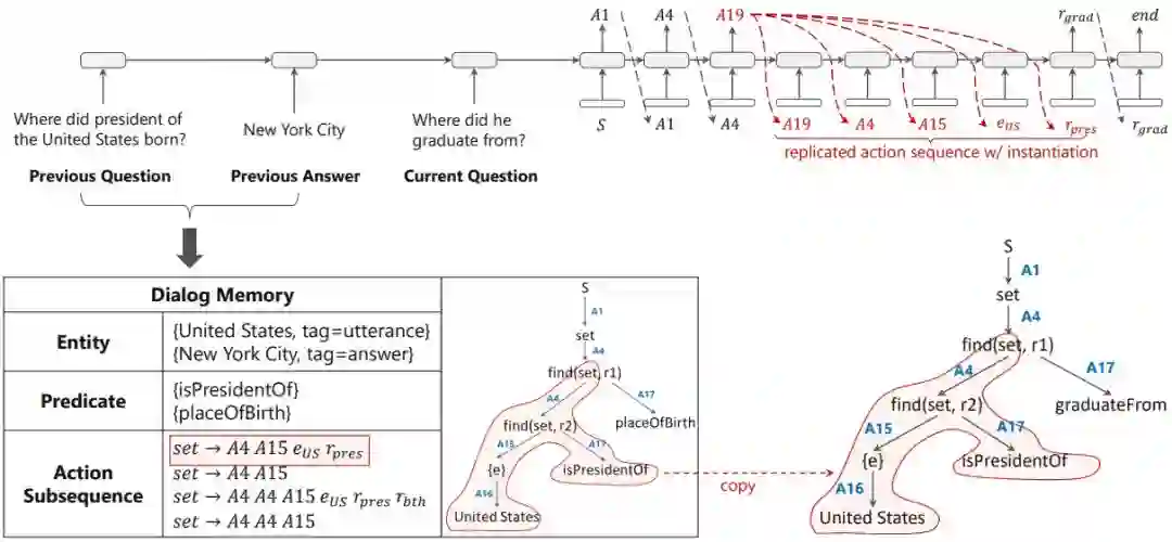 在此基础上,我们使用自顶向下的方式预测当前问题的逻辑表达。我们使用了序列到动作(sequence-to-action)的模型,该模型将输出序列化语义表示转换为输出遵循语法的动作序列,不仅可以利用编码器-解码器框架建模序列的优势,还可以保证输出的语法正确性。此外,该模型可以非常自然地利用上下文知识。如图5所示,我们在 Dialog Memory 中记录了历史问句的语义解析结果,在输出每个动作时都有一定的概率复制历史的语义表示子序列。模型的具体细节请参考[3]。