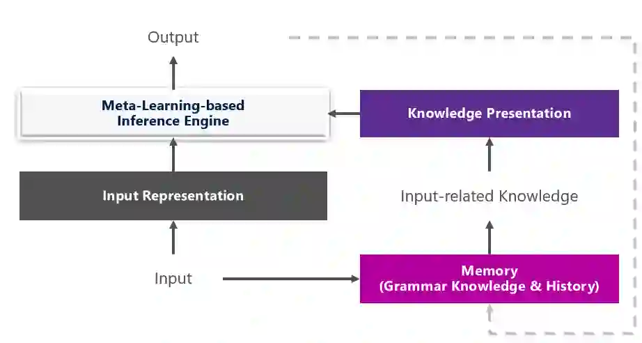 我们提出了如图3所示的机器推理模型,其中共利用了三种知识:第一种是语法知识(grammar knowledge),该模型会在语法知识的指导下生成语义表示中的每个单元,对于语义分析任务来说,生成的语义表达要在语法正确的前提下正确表达问题的含义;第二种是对话历史中的上下文知识,该模型会记录历史问句的语义解析结果,并利用其生成当前轮问题的语义表示,这对处理多轮问答中的省略(实体省略或意图省略)尤为重要;第三种是数据知识,我们从训练数据自动检索与当前数据相似的实例,通过基于元学习(meta-learning)的推断方法获得与当前样例更相关的“个性化”模型。