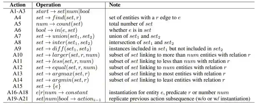 在基于知识图谱的问答场景下,我们定义了如图4的语法操作,包括查找、比较、计数、复制历史逻辑表达等。语法中每个动作操作都可以看做一个推演规则,左边是数据的类型,右边是可以推演出该类型数据的函数,函数中包含特定类型的参数。