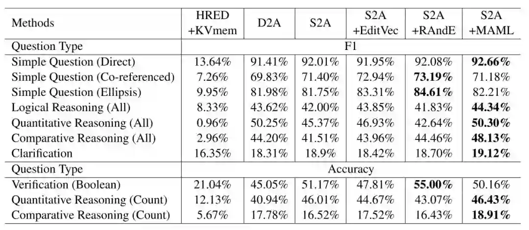 受训练数据中统计分布的影响,基于神经网络的生成模型很容易生成通用的序列[6]。我们提出了基于元学习的推断模型缓解这一问题。具体地,对于任一输入,我们自动从训练数据集中查询与其语义相似的样本,随后在基本模型 f(θ) 的基础上微调,获得为当前样本量身定做的模型 f(θ^')。在训练的过程中,我们需要同时学习基本模型 f(θ) 和在查询样本上把 f(θ) 微调到 f(θ^') 的过程。我们将这一过程建模为元学习,在训练过程中同时训练这两个过程,如图6所示。更多细节请参考[4]。实验结果如图7所示,我们提出的多轮语义分析和问答方法在 IBM 研究院多轮复杂问答任务 CSQA 上取得了目前 state-of-the-art 的结果[3][4]。