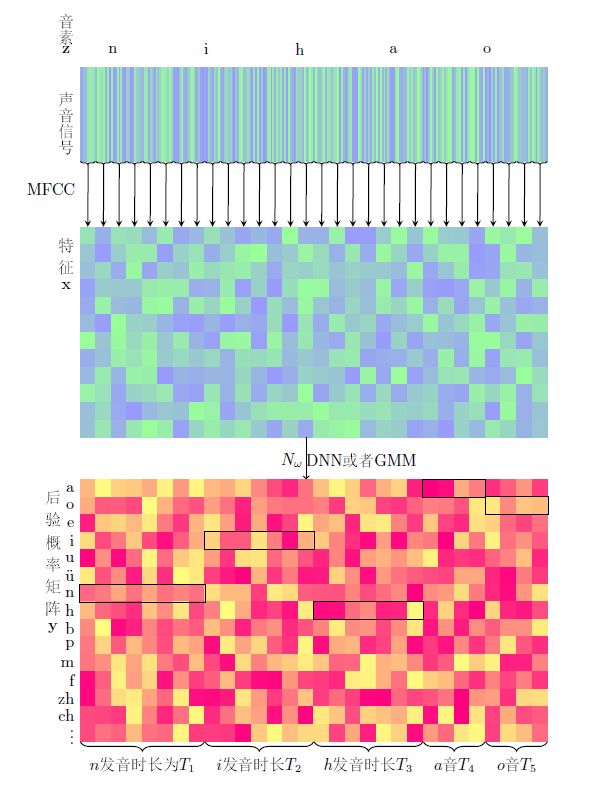 z=(z1,z2,z3,…zU)z=(z1,z2,z3,…zU)表示这段样本语音对应的正确的音素。比如,一段发音“你好”的声音,经过MFCC计算后,得到特征xx, 它的文本信息是“你好”,对应的音素信息是z=[n,i,h,a,o]z=[n,i,h,a,o](这里暂且将每个拼音的字母当做一个音素)。