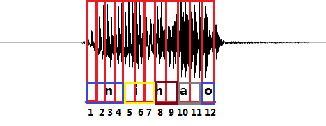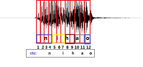 上图是“你好”这句话的声音的波形示意图, 每个红色的框代表一帧数据,传统的方法需要知道每一帧的数据是对应哪个发音音素。比如第1,2,3,4帧对应n的发音,第5,6,7帧对应i的音素,第8,9帧对应h的音素,第10,11帧对应a的音素,第12帧对应o的音素。(这里暂且将每个字母作为一个发音音素)