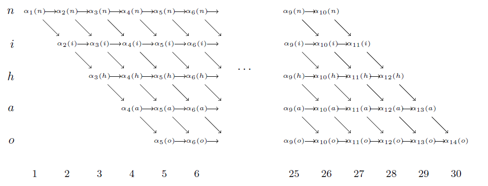 首先,根据前面的例子,找到所有可能被压缩为z=[n,i,h,a,o]z=[n,i,h,a,o]的路径,记为{π|B(π)=z}{π|B(π)=z}。 可知所有ππ均有[n,n,n,….,n,i,…..,i,h,…..h,a,….a,o,…,o][n,n,n,….,n,i,…..,i,h,…..h,a,….a,o,…,o]的形式,即目标函数只与后验概率矩阵y中表示n,i,h,a,on,i,h,a,o的5行相关,因此为了简便,我们将这5行提取出来,如下图所示。