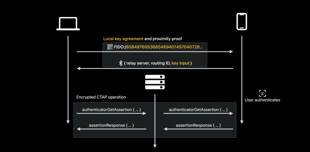 同样是扫码行为,通行密钥不同的地方在于它可以脱离对具体服务端、客户端的依赖,变成一种纯粹的身份认证工具。因为它本质上是 FIDO 对通行密钥的扩展——客户端到认证器协议规范(Client to Authenticator Protocol,CTAP),也就是外部认证器通过中继网络(Relay Network)向用户的互联网接入设备局部传递认证证书——