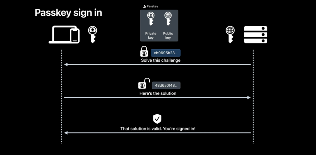 以 WWDC 中的例子进一步展开说明,在用户完成第一次登录以后,服务端和用户终端分别持有由用户终端生成的公钥和私钥。如果这时用户再需要登录,用户将用户名发送给服务器以后,服务器用用户名对应的公钥创建一个「口令(challenge)」发送给用户终端,放到上面的例子里就是邮件投递到了用户的传统信箱里;用户这时可以使用私钥解答该「口令」并将对应的「答案(solution)」再发送给服务端,放到上面的例子里就是用户取出了这份邮件并根据这份邮件给发信人返回了一个正确的信件。如此,服务端便能通过比对答案是否正确从而验证终端是否为公钥的主人了。当然,上述的通讯过程都是通过 HTTPS 加密的。