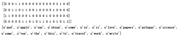在词袋模型进行词频统计后,就可以用词向量表示这个文本。这里举一个直接用scikit-learn的CountVectorizer类来完成的例子,这个类可以完成文本的词频统计与向量化,代码如下: