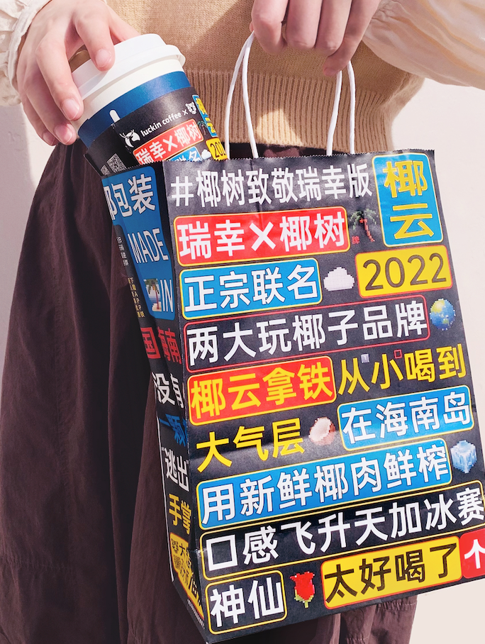 本次联名款,除了在原料上使用了椰树牌椰汁,杯套与包装袋也采用了椰树牌椰汁的经典设计风格。