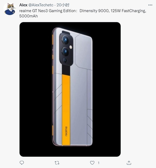 近日,realme 副总裁、realme 全球产品线总裁王伟在与网友互动式透露,搭载联发科天玑 9000 旗舰处理器的 realme 新品已经安排上了,可能会在下个月发布。据悉该手机很可能是曝光的 realme GT Neo3 游戏版。而昨日外国数码博主就曝光了一张疑似 realme GT Neo3 的渲染图,设计风格非常有特色,背面有橙色的装饰条,机身右侧有橙色的肩键,从外观设计不难看出,这是一款定位游戏的性能机型。