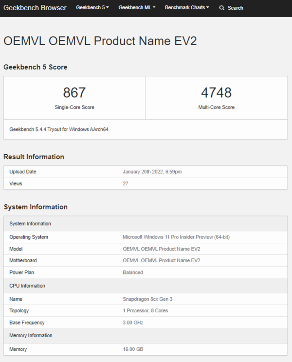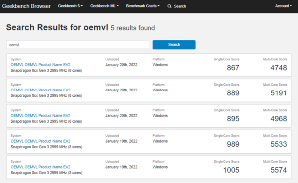 Geekbench 上出现了几个基准测试,它们都以“OEMVL OEMVL Product Name EV2”的名称出现,根据外媒 WinFuture 的说法,这些是新的 Microsoft Surface 的首次试运行,该设备很可能是下一代 Surface Pro X,虽然产品名称无法确认它是否是新的 Surface Pro X,但“EV2”暗示它是设备验证测试(EVT)原型。