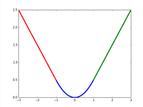 坐标的差距。该函数在 之间间为二次函数,而其他区域为线性函数,作者表示这种形式可以增强模型对异常数据的鲁棒性,整个函数在matplotlib中画出来是这样的