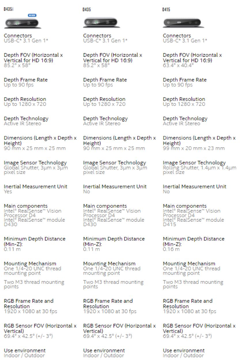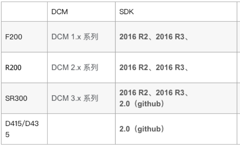 截至2019/08/07,英特尔Realsense系列产品包含: (1) Realsens200系列相机:F200和R200; (2)Realsense300系列相机: SR300和ZR300;(3)视觉处理器D4系列(硬件): D4和D4M; (4) RealsenseD400系列模块(硬件): D400,D410,D415,D420和D430; (5)最新发布的相机: D415 (D4视觉处理器和D415模块), D435(D4视觉处理器和D430模块)和D435i(D435+IMU)。