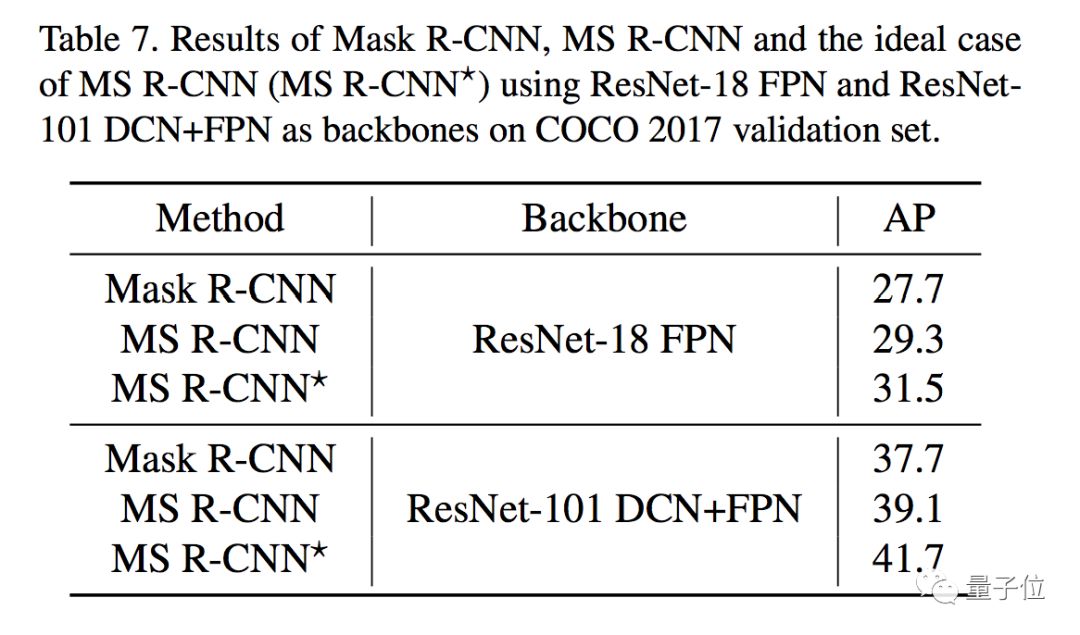 实验证明,在挑战COCO benchmark时,在用MS R-CNN的蒙版得分评估时,在不同基干网路上,AP始终提升近1.5%。